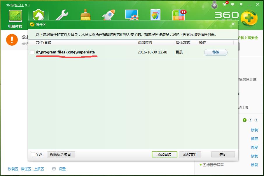 360安全卫士添加信任列表 | 浏览:686 | 更新: 2016-09-09 10:25 | 标签:速达图文教程 速达视频教程 了解详情 优惠信息限时特价优惠,走过路过不要错过! 速达软件是企业应用比较广泛的企业财务和业务管理软件。 适合版本 速达财务,速达v3.net财务,速达V3财务 方法/步骤 360安全卫士添加信任列表 2016-07-30 START 1 1.打开360安全卫士,点到“木马查杀”选项卡,点左下角“信任区”。 2 2.在弹出的框中,点“添加目录”。 3 3.选择信任目录时,找到速达软件安装路径,一般是默认的superdata文件夹。 4 4.点“确定”。 5 5.信任列表中有了这个目录,就是添加信任成功了,关闭退出360安全卫士就行了。 END 注意事项 一定要定期做好数据备份,以防电脑突然出现问题导致数据丢失。 关注本网,查看更多使用教程。 为你推荐 速达财务凭证批量打印12082016.9.19 速达3000凭证批量打印12932016.9.19 速达财务报表查询16862016.9.15 速达财务反结账10082016.8.22 电脑Ip地址查看方法10602016.8.01 相关标签速达财务速达3000速达5000